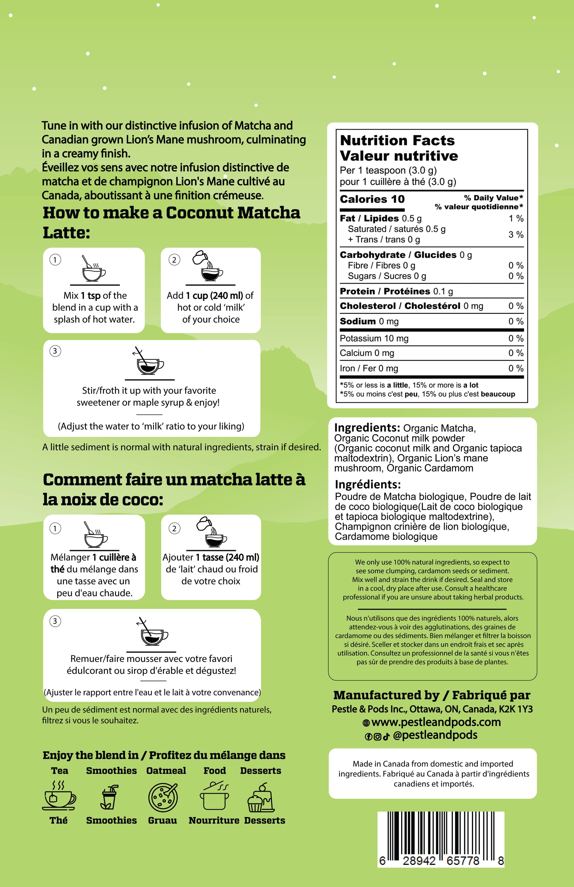 A creamy blend of superior Japanese matcha and Canadian-grown Lion’s Mane mushroom. Rich in antioxidants and naturally balanced caffeine, this smooth latte supports calm focus, mental clarity, and steady energy without the jitters of coffee.